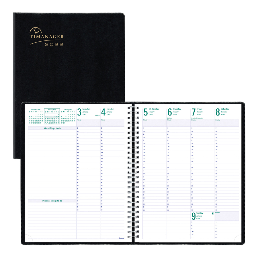 Six-day planner offers January through December planning with each week shown on a two-page spread. Appointment schedule runs between 7 AM to 8:30 PM in 30-minute intervals. Twin-wire binding allows the planner to lie flat on your desk for easy handwriting. Detailed format includes a monthly planner at the beginning of each month. A countdown of the days passed and still to come help you stay on track all year long. Telephone/address section helps you easily keep track of important contacts. Calendars for previous, current and following month help you plan ahead for upcoming events.